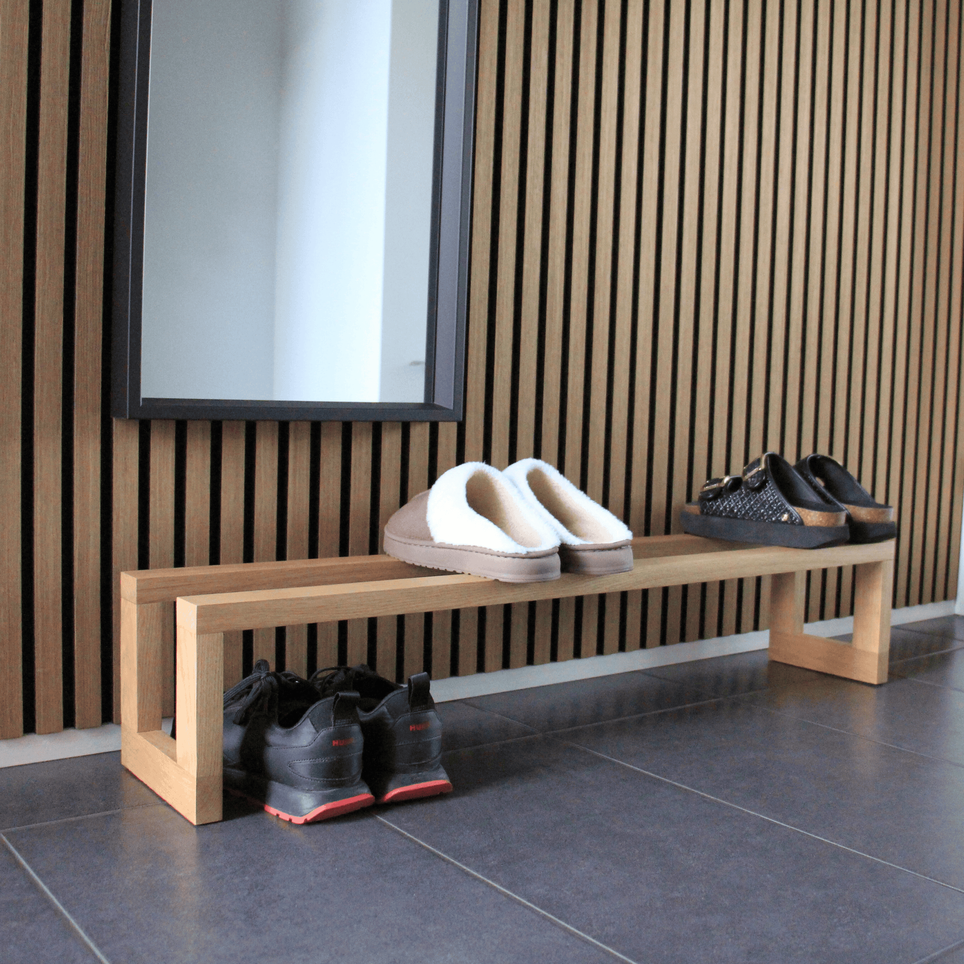 Zana Lang er designet til at strække sig ud og skabe ro langs gulvet. Med sin ekstra bredde og lave profil fungerer den som en diskret men rummelig skoopbevaring, der ikke stjæler udsynet. Det aflange format understreger rummets bredde, mens de massive egetræslameller tilføjer varme og tekstur helt nede ved gulvet. Perfekt til at udstille skoene eller som en minimalistisk base for planter og magasiner.